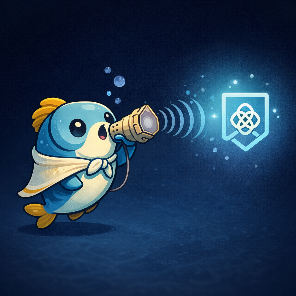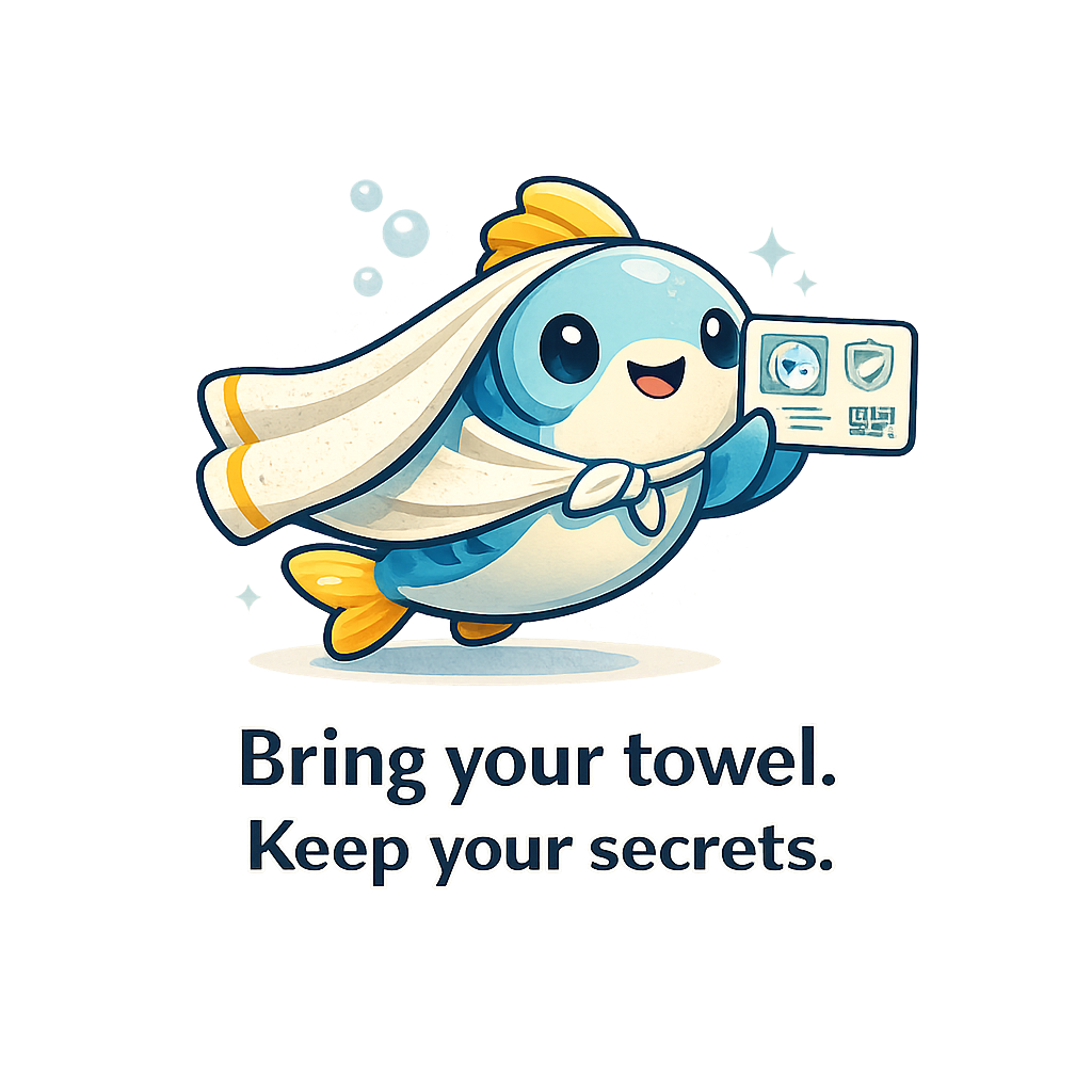 “The Towel Is a Credential” (mascot-style hero) A cute cartoon fish wearing a tiny towel-cape, holding a little “credential card” like a passport stamp, with a subtle shield icon watermark. Why it fits: instantly communicates “identity you carry, not identity they store”. Tone: playful, not childish; clean vector. Tagline pairing: “Bring your towel. Keep your secrets.”