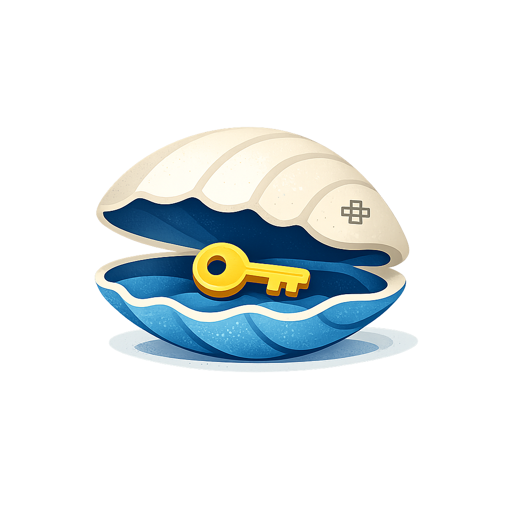 Privacy Shell Fish. “Self / Shell / Fish” (pun-first, brand-first) A minimalist illustration of a shellfish (clam/oyster) slightly open, revealing not a pearl but a key or credential token. Why it fits: makes the domain pun legible at a glance. Style: flat vector or gentle grainy illustration. Hidden detail: tiny “⿻” symbol etched on the shell.